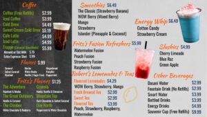 Luckily, delicious foods and refreshing beverages await at Fritz’s Café. Explore our sweet, sassy, saucy, and savory menu for crowd-pleasing meals, snacks, treats, and more. Fritz’s Café is the perfect place to refuel for your next adventure!