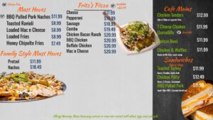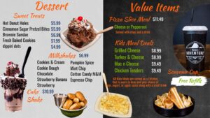 Fritz’s Café, located on the entry level, is open during select hours, which vary seasonally. We serve amazing pizzas, sandwiches, loaded nachos and fries, desserts, and more. There are also times when we serve drinks and snacks only.