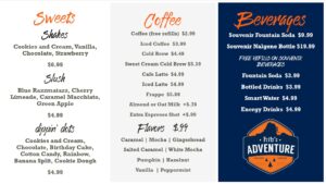Luckily, delicious foods and refreshing beverages await at Fritz’s Café. Explore our sweet, sassy, saucy, and savory menu for crowd-pleasing meals, snacks, treats, and more. Fritz’s Café is the perfect place to refuel for your next adventure!